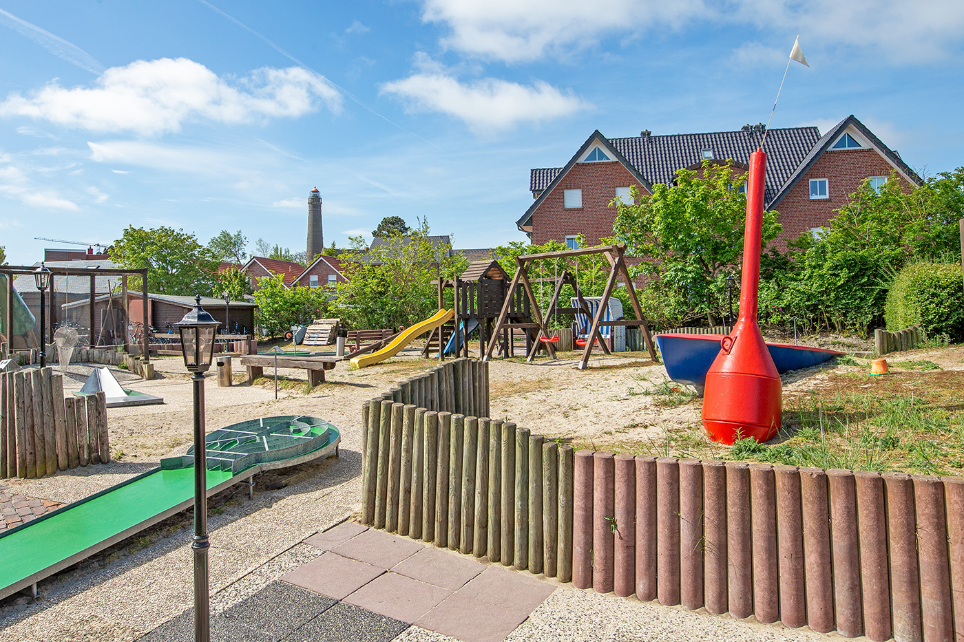Mit auf dem Gelände des Fahrradverleihs ist ein 18-Loch-Minigolf-Platz integriert. Neben vielen unterschiedlichen und spannenden Bahnen erwarten Sie viele Ruhemöglichkeiten, wie zum Beispiel Strandkörbe und einige Bänke. Der gesamte Golfplatz ist in einem abwechslungsreichen, maritimen Flair gestaltet und bietet ein interessantes Ambiente.